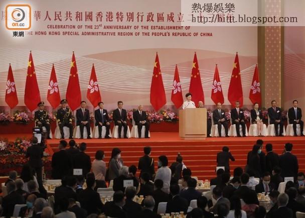 林鄭月娥(台上中間)在七一酒會致詞時一度哽咽。(黃仲民攝)
