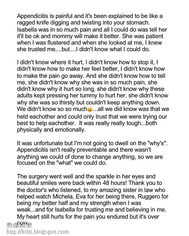 Margaret今日在IG中,貼出多張Isabella在醫院的照片,並撰長文表示她最近因患上盲腸炎要入院做手術。雖然Isabella不善表達,但Margaret平時照顧女兒無微不至,她從日常表現中很快就發現女兒的身體出狀況。經初期診斷後亦以為是食物中毒或腸胃問題引致,但看到女兒越來越嚴重,Margaret亦即時帶她到急症室求醫,檢查後證實她患上盲腸炎,然後馬上進行手術,幸而手術完成後的48小時內Isabella已沒大礙。Margaret又指盲腸炎沒有真正的方法預防,所以只能專注於病發後可以做的事情。
