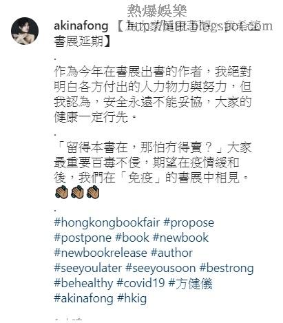 同樣,將在書展推出新書《破天方—踩在斜槓線上》的前主播方健儀,昨日仍在IG分享剛印好的新書,並指會從版稅中每本抽出十元捐給聖雅各福群會。不過眼見疫情仍未受控,今早她在IG發文,指「安全永遠不能妥協」,「作為今年在書展出書的作者,我絕對明白各方付出的人力物力與努力,但我認為,安全永遠不能妥協,大家的健康一定行先。」又指「留得本書在,那怕冇得賣?」,期望在疫情緩和後,「我們在『免疫』的書展中相見」。
