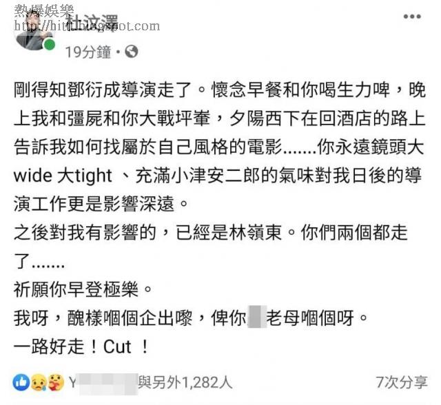 杜汶澤昨晚在facebook慨嘆這位老前輩走了,悼念昔日亞視之友,阿澤回想他們在亞視相處點滴:「鄧衍成導演走了。懷念早餐和你喝生力啤,晚上我和殭屍、和你大戰坪輋,夕陽西下在回酒店的路上告訴我如何找屬於自己風格的電影……你永遠鏡頭大wide、大tight,充滿小津安二郎的氣味對我日後的導演工作更是影響深遠。之後對我有影響的,已經是林嶺東。你們兩個都走了!祈願你早登極樂,我呀,醜樣嗰個企出嚟,畀你X老母嗰個呀!」