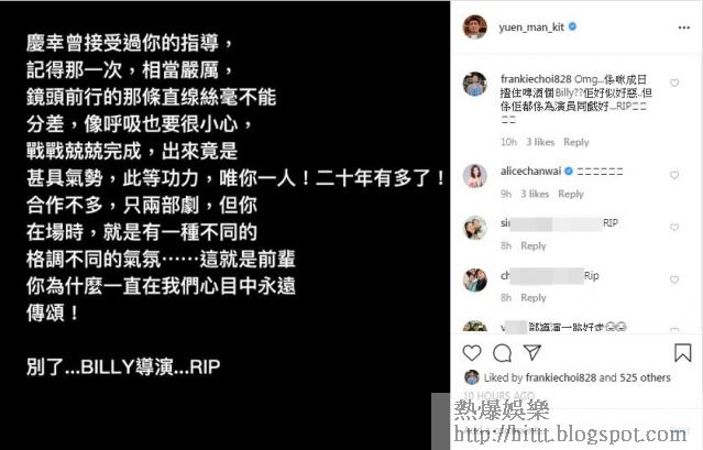 袁文傑亦在IG貼出黑底白字的照片:「慶幸曾接受過你的指導,記得那一次,相當嚴厲,鏡頭前行的那條直線,絲毫不能分差,像呼吸也要很小心,戰戰兢兢完成,出來竟是甚具氣勢,此等功力,唯你一人,二十年有多了,合作不多,只有兩部劇,但你在場時,就是一種不同的格調、不同的氣氛……這就是前輩你為甚麼一直在我們心目中永遠傳頌!別了……Billy導演……R.I.P!」