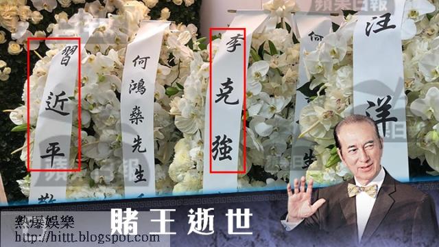 賭王生前是全國政協,在香港及澳門兩地分別獲大紫荊勳章及大蓮花榮譽勳章,而大陸最核心的兩代領導人亦有送花牌悼念賭王,當中國家主席習近平、國務院總理李克強、中央政治局常委趙樂際、全國政協主席汪洋、主管港澳事務的政治局常委韓正、國家副主席王岐山、人大常委會副委員長王晨、前總理朱鎔基、前總理溫家寶、國務院港澳辦主任夏寶龍等人都送上白菊花為裝飾的白花牌,聯寫上「何鴻燊先生千古」,而眾大陸領導人的花牌都擺放在主靈堂右邊的最佳位置。