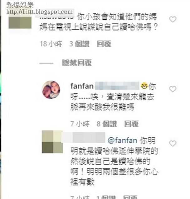 台灣歌手范瑋琪(范范)學歷一向成為網民攻擊對象,早前因為口罩風波,而絕迹社交網2個多月,直到最近才再度活躍分享近況,日前佢喺社交網上載孖仔飛飛翔翔玩耍影片,但網民就留言寸爆:「你小孩會知道他們的媽媽在電視上說謊說自己讀哈佛嗎?」令范范無奈回應說:「你呀.......唉,查清楚來龍去脈再來酸我很難嗎?」