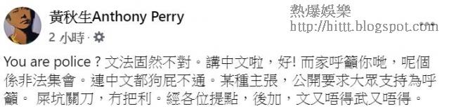 網民對這條片大剝花生,連影帝黃秋生今日都在FB熱烈討論,他留言:「You are police? 文法固然不對。講中文啦,好!而家呼籲你哋,呢個係非法集會。連中文都狗屁不通。某種主張,公開要求大眾支持為呼籲。屎坑關刀,冇把利。經各位提點,後加,文又唔得武又唔得。」網民大讚秋生所言「文又唔得,武又唔得」講得好,秋生神回:「固然係,但係掉得落屎坑,利都變唔利喇!」有網民則說:「歇後語引用錯誤!屎坑關刀係文(聞)唔得,武(舞)又唔得。無張利係周身刀仔。」秋生解答:「利都唔掉落屎坑喇!」