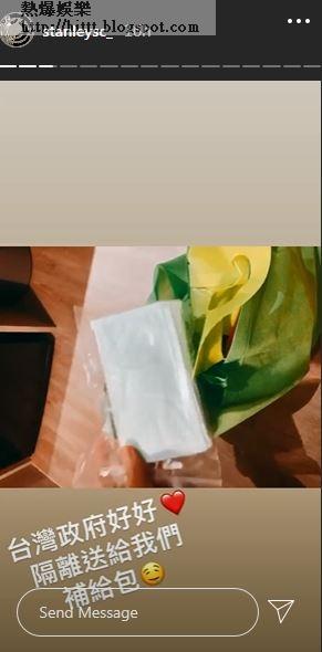 至於Stanley昨日亦在IG Story甫相,指台灣政府相當有心,向他派發一袋物資,當中包括有口罩、泡麵、零食,但他笑問:「但呢個泡麵,我可以點煮呀﹖」今日他則貼出在酒店房、坐在睡床上的相片,並留言:「隔離Day 3.5,雖然我悶到就嚟生菇,但其實係開心嘅,我每天最開心嘅事,就係我食咩好,所以大家幫忙介紹下」雖然有不少fans留言給他介紹台灣當地美食,但Stanley因不能外出,只能點叫一個雞腿套餐在酒店房內享用。