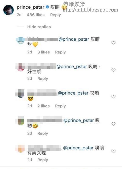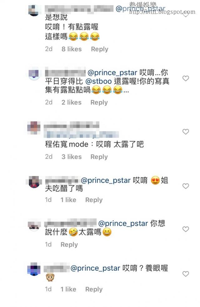 男友邱勝翊(王子)也留言:「哎唷!」加上得戚的emoji表情圖案,由於二人因疫情分隔港台兩地多月,即趁機打情罵俏,王子「遙距監控」Stephy,未知是否呷醋,不少網民就留言給王子,取笑王子,每句均以「哎唷」開頭,「哎唷太露了」、「哎唷姐夫吃醋了嗎」、「哎唷養眼」等,另有網民笑王子比Stephy更性感:「你平日穿得比Stephy還露喔!你的寫真集有露點點喎。」