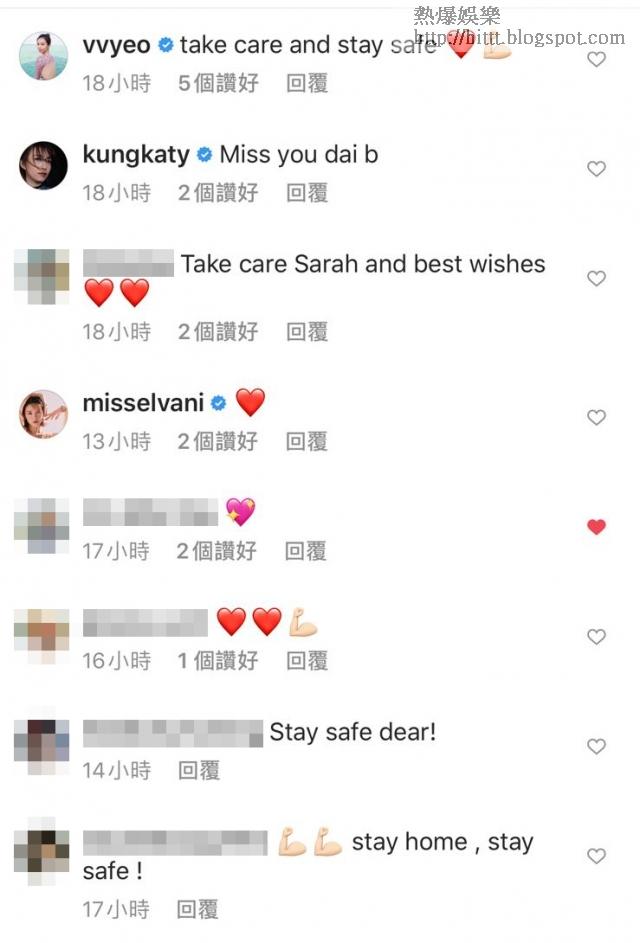 Sarah還表示保持社交距離是令確診數字回落的唯一方法,大家確實需要盡這個本份:「看見新聞,看到家庭成員被分隔在不同的醫院病房和隔離營,除非有疫苗,作為父母,我總認為犧牲少許來確保家人的安全和健康,真是輕而易舉!」她的好友楊秀惠、龔嘉欣、李靄璣、倪晨曦和沈卓盈都留言叮囑Sarah要小心身體。