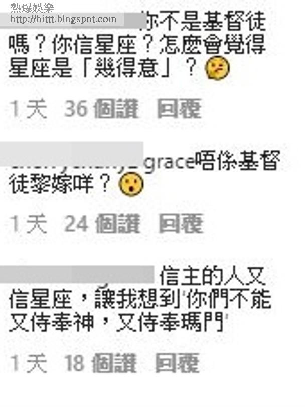 雖然被網民洗版狂插「偽基督」,但陳凱琳卻沒有回覆,亦沒有刪除留言,幸而亦有網民為她抱不平:「星座又唔係宗教,星座係每個人性格分析!」