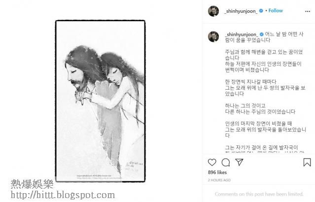 今早申鉉濬就於IG發文,疑似回應近期的是非,內容提到夢見某人和主一起在海邊散步的場景,當時沙灘上留下兩對腳印,一對是他,另一對是主,但當生命的最後一個場面出現時,他回頭看了看沙上的腳印,很多時只有一對腳印,申鉉濬感慨地表示:「他明白到,當時是他人生中最艱難、最悲傷的時期。」之後又表示:「在他人生最困難的時期,只有一對腳印,在他最需要主的時期,為甚麼主拋棄了他。」當時主就回應:「我愛你,所以不拋棄你,在你苦難的時候,只看到一對腳印,是我揹着你走的時候。」