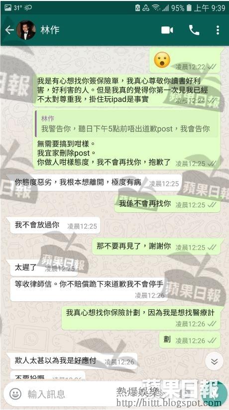 至於提及的涉嫌恐嚇,讀者提供和林作的WhatsApp對話截圖,當中有林作罵Vanessa:「你呢種垃圾,我會給你一個教訓」、「我不會放過你」、「等收律師信。你不賠償跪下來道歉我不會停手」、「我會持續搞你」、「我會斷你米路」等,最後林作要求她出道歉post,否則會採取法律行動。對話當中,Vanessa曾經向林作道歉:「我覺得做人無需要咁樣」、「你太過於激動」、「如果我得罪你,好。我道歉,對不起」、「但我不會找你簽保單了,抱歉」。