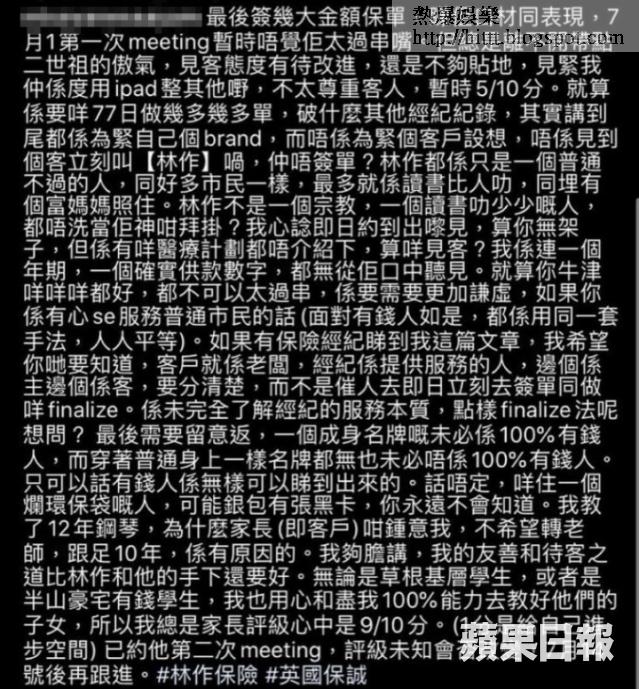 讀者Vanessa表示會向保監局和林作所任職的保險公司作出投訴,並提供了在社交平台發表的一則對林作表現的評論文章截圖,她對《蘋果》聲稱:「結束會面後我在自己的私人戶口發佈了一些對會面的感受,覺得自己不被尊重,最後收到恐嚇。」她在評論文章提到對林作的評價,「但總是離不開帶點二世祖的傲氣,見客態度有待改進,還是不夠貼地,見緊我仲喺度用iPad整其他嘢,不太尊重客人,暫時5/10分……就算你牛津咩咩咩都好,都不可以太過串(寸),係要需要更加謙虛。」