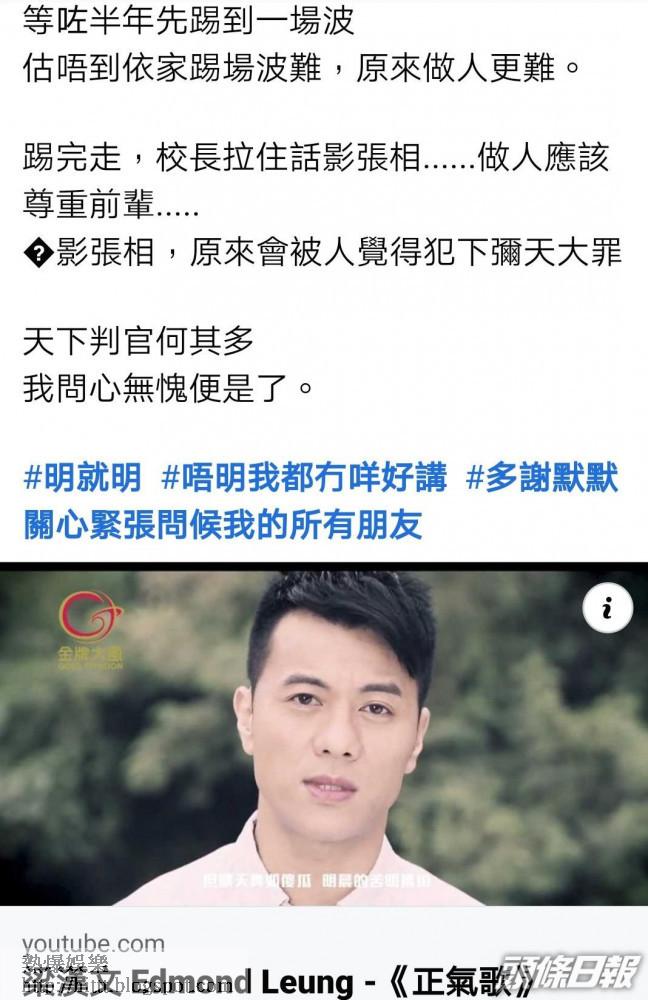 今日梁漢文透過個人FB 宣傳自己的作品《正氣歌》同時,發表個人立場。留言:「等咗半年先踢到一場波,估唔到𠵱家踢場波難,原來做人更難。踢完走,校長拉住話影張相......做人應該尊重前輩..... 影張相,原來會被人覺得犯下彌天大罪。天下判官何其多,我問心無愧便是了。 #明就明 #唔明我都冇咩好講 #多謝默默關心緊張問候我的所有朋友」