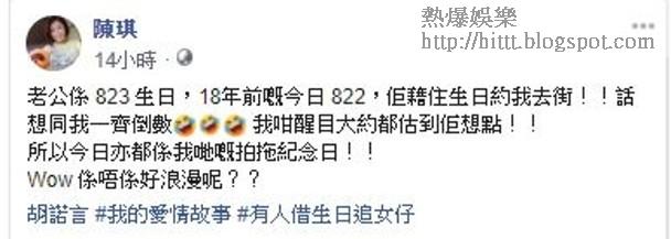 過咗凌晨12踏入23日,陳琪再喺社交網上載兩人合照,冧爆話:「Happy birthday to 老公 🐷!!我要年年月月都陪住你!!」胡仔都好識做:「多謝胡c9精心安排...」一班圈中人都祝佢生日快樂,胡蓓蔚更笑話:「胡伯生日快樂!身體健康!買多幾架車!買多幾層樓!」