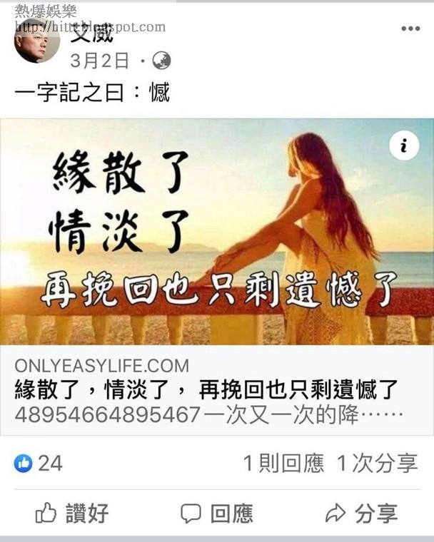 再翻查艾威社交網,佢更多次轉發關於情淡、緣散、放手等字眼嘅文章,並留言如放、離、斷等字,令人不禁聯想二人感情出現問題。