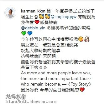 唔好以為Karmen受了刺激,一反常態,原來8月27日是她的28歲生日,所以幾位大學閨蜜一齊為壽星女慶生,不過,就唔見男友小小超在場。