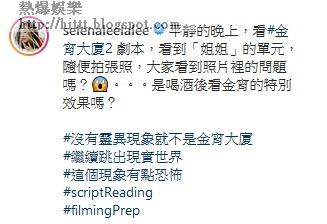 李施嬅在個人IG貼文表示,《金宵大廈2》即將開拍,為了研究角色,她日前邊飲紅酒,邊看劇本,她說正當十分享受之際,卻發現當時拍下的照片有些詭異感覺,忍不住要跟大家分享。