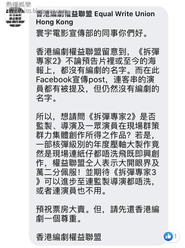 該聯盟今日在其社交網出post再鬧,帖文以「新制度建立前,世事總是不斷循環」為題,指《拆2》在社交網的專頁中,即使客串的演員都有列出名字,相反編劇名字卻無影,而該片的編劇則是李敏和邱禮濤,故聯盟留言表示︰「知名如李敏也獲如此待遇,可想業內大批基層編劇狀況何其堪虞!」帖文中更提出《掃毒2天地對決》曾出現同樣情況,湊巧是編劇同樣是邱禮濤、李敏。
