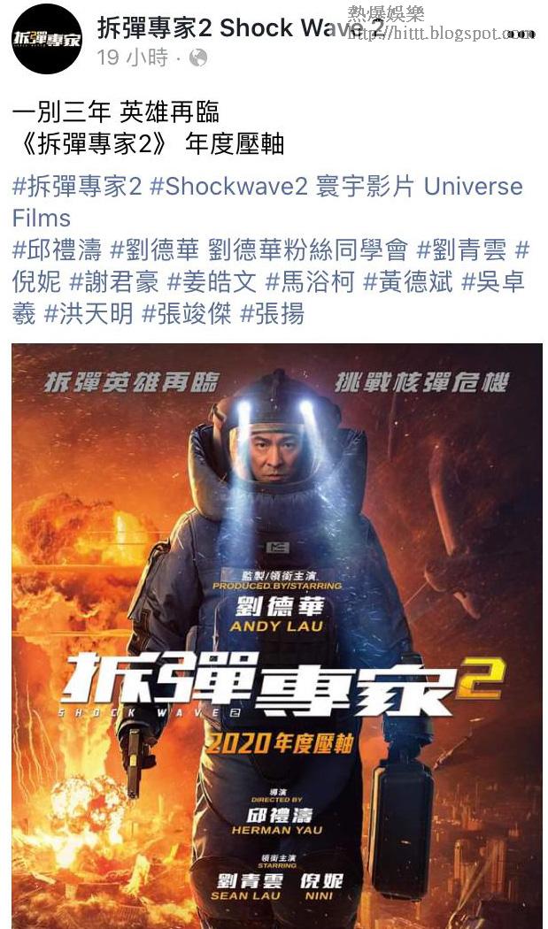 由劉德華監製兼主演、邱禮濤執導的新戲《拆彈專家2》,昨日寰宇電影公司推出其預告片,而該片將於年底上映。雖然有不少網民在《拆》片的社交網留言表示期待上映,但專頁「香港編劇權益聯盟」就留言表達不滿,指該片在預告片和海報上均欠缺編劇名字。