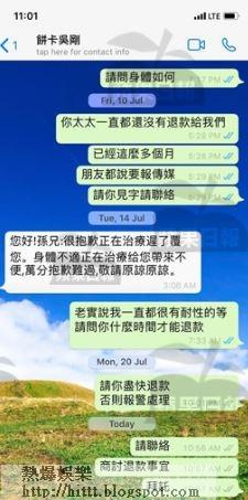 孫先生續說:「4月底時,吳剛有回過短訊,佢自稱病咗喺深圳留院,佢仲傳咗一張瞓病床相過嚟,仲話自己身體唔舒服,要稍遲先過到數,佢自己話要多補5000蚊畀我做利息,當然最後又係唔肯畀退款,拖到7月時,我都有同吳太講仲唔畀錢我去報警,佢選擇性覆吓又唔覆,更退咗group,好冇誠信。吳剛7月中係WhatsApp過我一次,佢聲稱『很抱歉正在治療,遲了覆你。身體不適正在治療,給你帶來不便,萬分抱歉難過,敬請原諒原諒』,而家都8月喇,近日搵佢哋又完全冇反應。當中啲錢唔係全部我嘅,仲有我幫朋友訂飛嘅錢。」