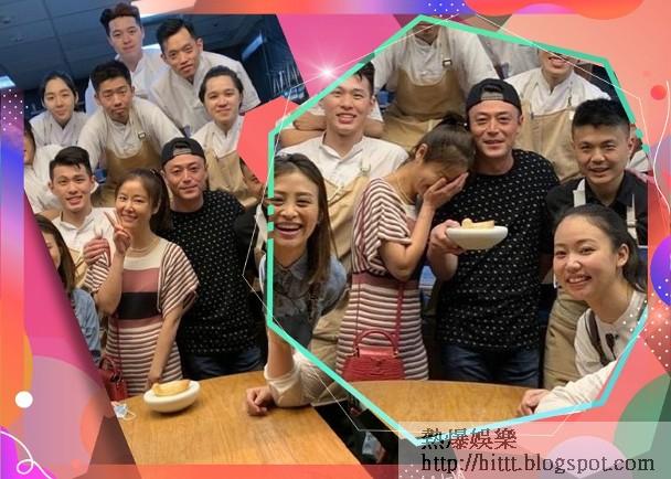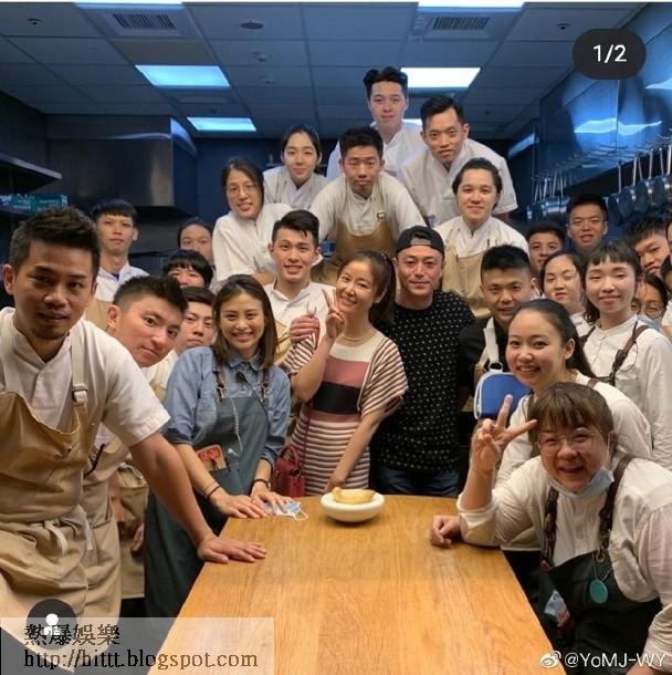 合照中,除咗主角二人,更有大班着上廚師制服嘅旁人,而林心如就同霍建華黐到實企,其中一張仲見到林心如勁怕醜咁低頭掩面,仲成個人挨晒落老公度,另一張就見到佢舉V笑晒咁,睇嚟佢應該好滿意今次嘅慶祝啵。