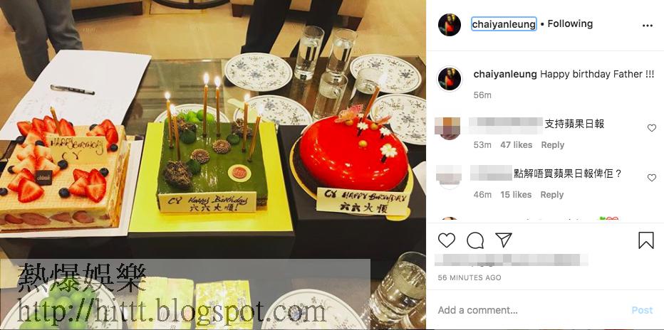 「最強藍絲KOL」前特首梁振英今日66歲生日,依然緊守他的鍵盤戰士崗位,相當關心《蘋果》的動態,今日連出幾個帖文關心報紙的銷量,而他的寶貝女梁齊昕就相當孝順,為他賀壽,還在社交平台貼了三個生日蛋糕的相片,而在IG story中,更上載了她爸爸的切蛋糕相,不過齊昕就未有入鏡。