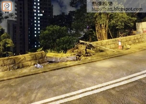 藝人楊明日前在港島馬己仙峽道發生車禍,撞毀一段3米砌石牆。