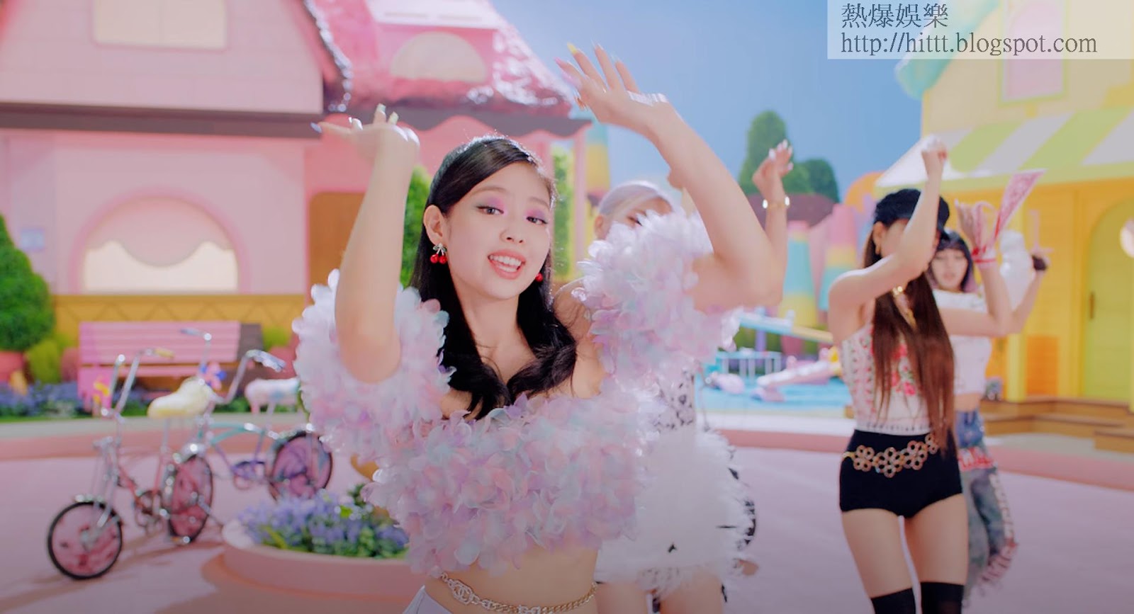 被封「人間香奈兒」的Jennie,造型配飾都是來自Chanel, 第一個場景中,以Lirika Matoshi 夢幻上衣配上 Chanel 腰鏈,之後的黑白網球妹造型,也戴上 Chanel 手套、髮夾、腰包,其中一襲可愛Care Bears印花裙,更將Chanel織帶綁成手飾。