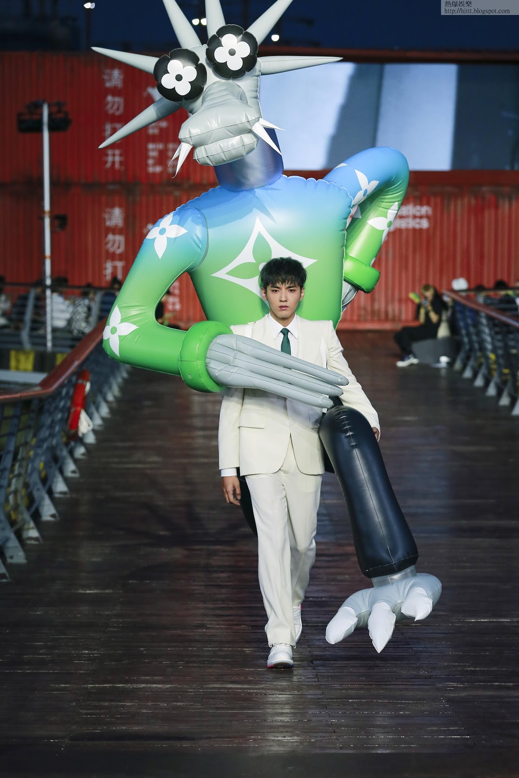 吳亦凡穿着白色西裝孭着大型吹氣吉祥物走秀。