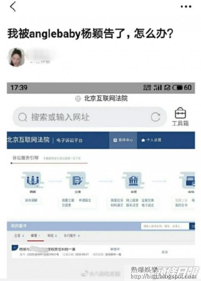 近日這「美國女人」在社交網求助:「我被Angelababy告了,怎麽辦」,文中指判決書內容要該網民賠償23萬人民幣,並即時於網上道歉。其他網民均認為該網民是次被Baby提告是應有此報,還有臉在網上求救。