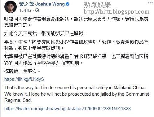 對於「禾野男孩」不領情一事,黃之鋒再度發文撐對方,指要是「禾野男孩」沒演這齣「反枱戲」,早就被中共捉走監禁,故他呼籲網民不用就此漫畫而替自己感到不值,並祝願「禾野男孩」能平安。