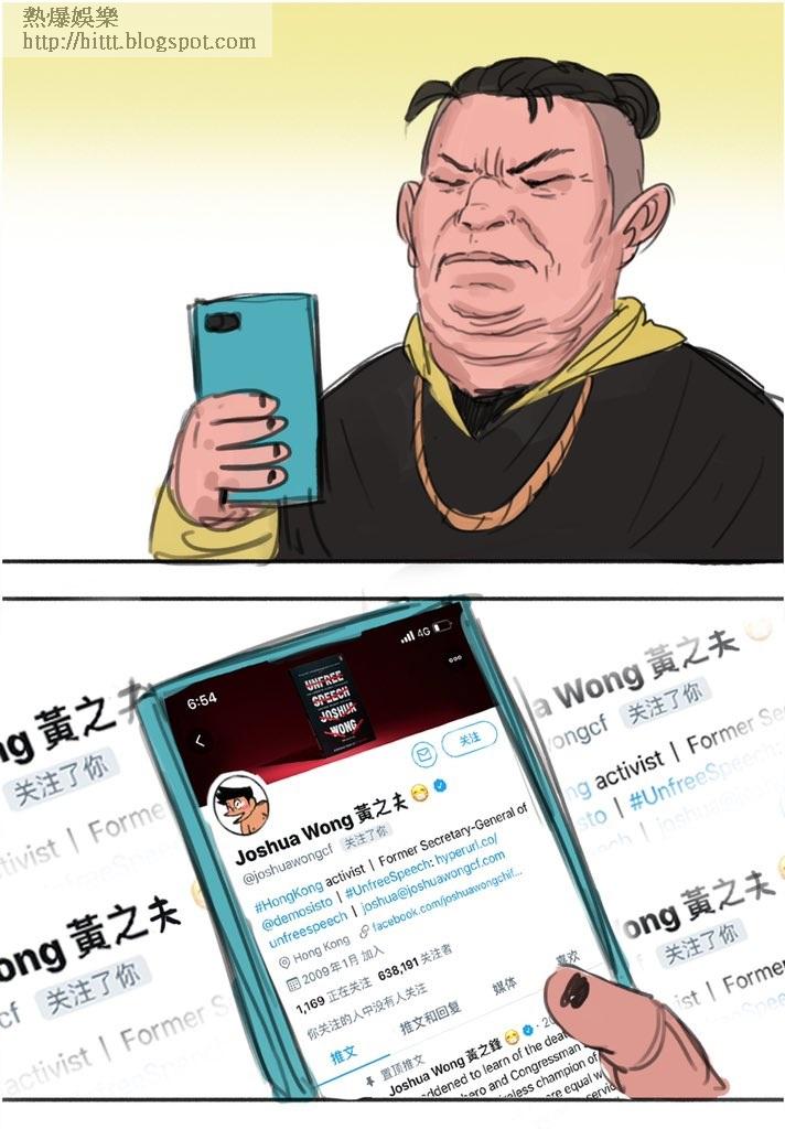 黃之鋒亦有關注「禾野男孩」的同人作,及其微博被封一事,故他follow「禾野男孩」的Twitter,並轉發對方的post,留言表示支持應該有創作自由。不過「禾野男孩」看到黃之鋒的舉動,竟以漫畫在諷刺對方,指被黃之鋒follow是比屎尿屁還嘔心的事。此圖在Twitter一出,又引起檢舉風波,「禾野男孩」被指是小粉紅,他原先的Twitter賬號也很快被封鎖。