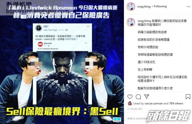 即使轉投保險業界,一向語不驚人誓不休的林作仍不忘博取關注,早前的「4萬5西裝論」已經引起網民聲討。昨日林作又在個人社交平台發表出位言論,引用電影《黑豹》男主角Chadwick Boseman的死訊賣保險,表示:「45歲就大腸癌過身。疾病無從預測。一定要早啲check。check之前,記得搵林作保險。」貼文發佈後,馬上引來大量網民不滿,指責他消費死者。林作堅稱自己冇做錯與網民引發罵戰。連王貽興亦睇唔過眼加入「戰團」,斥責林作消費死者行銷冇道德底線,又指他冇家教,丟晒令壽堂架。