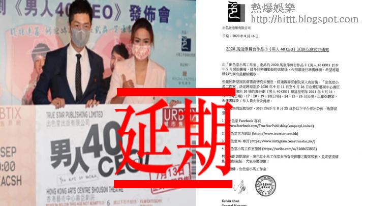 由馬浚偉(馬仔)、林子博和黎瑞恩等人演出的舞台劇《男人40 CEO》,原定9月11至26日於灣仔藝術中心壽臣劇院公演,但因為武漢肺炎在香港情況仍未受到控制,劇團今日宣佈舞台劇延期,擔任舞台劇編、導、演和監製的馬仔,今日拍攝短片表示不想觀眾、演員和工作人員因此要冒險,與劇團和場地有關方面人員溝通後決定延期到2021年6月11至26日在同一場地舉行。