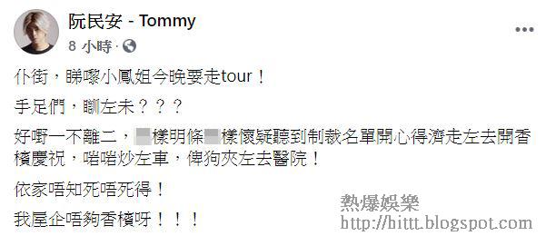 楊明涉醉駕被捕新聞,繼美國財政部昨晚香港時間公佈制裁特首林鄭月娥等11名中國及香港官員消息而來。黃絲的阮民安即在FB贈㷫:「仆街,睇嚟小鳳姐今晚要走tour!手足們,瞓咗未?好嘢一不離二,X樣明條X樣懷疑聽到制裁名單,開心得濟,走咗去開香檳慶祝,啱啱炒咗車,畀狗夾咗去醫院!依家唔知死唔死得!我屋企唔夠香檳呀!!」