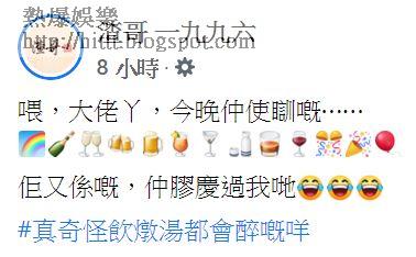 譚小環老公、「渣哥」蔡強榮也在FB出post:「喂,大佬吖,今晚仲使瞓嘅?佢又係嘅,仲膠慶過我哋?#真奇怪飲燉湯都會醉嘅咩」渣哥不忘揶揄賣燉湯的楊明。而王宗堯也在FB留言:「開香檳又關你事嘅?做咩慶祝啊!」