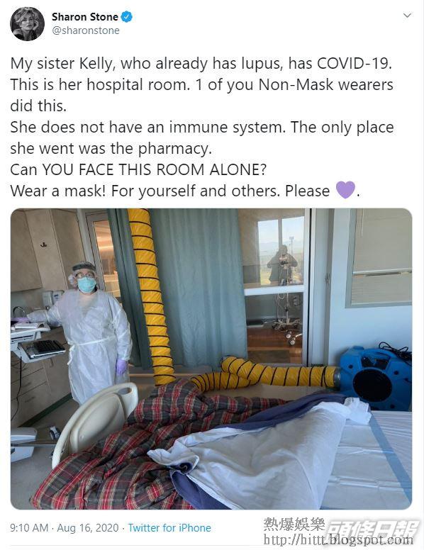 新冠肺炎疫情全球蔓延,美國確診個案累計增至逾540萬,超過17萬人喪生。在美國時間本月16日朝早,荷李活女星莎朗史東(Sharon Stone)於社交網透露妹妹Kelly也「中招」,並貼出妹妹的隔離病房照,莎朗史東嬲爆寫道:「我妹妹Kelly本身患紅斑狼瘡症,現在又感染了新冠肺炎,這是她的醫院病房,是你們其中一個不戴口罩的人造成這個情況。她沒有免疫力,她只去過藥房。你們能夠獨自身處這間房嗎?戴口罩!為自己及他人,拜託。」剛才,她又轉發Kelly臥病在牀的自拍,又叫網民為妹妹同妹夫Bruce祈禱。此外,Kelly亦拍片表示自己要靠呼吸機幫助才能呼吸,並勸籲大家為了愛的人戴口罩及接受檢測。