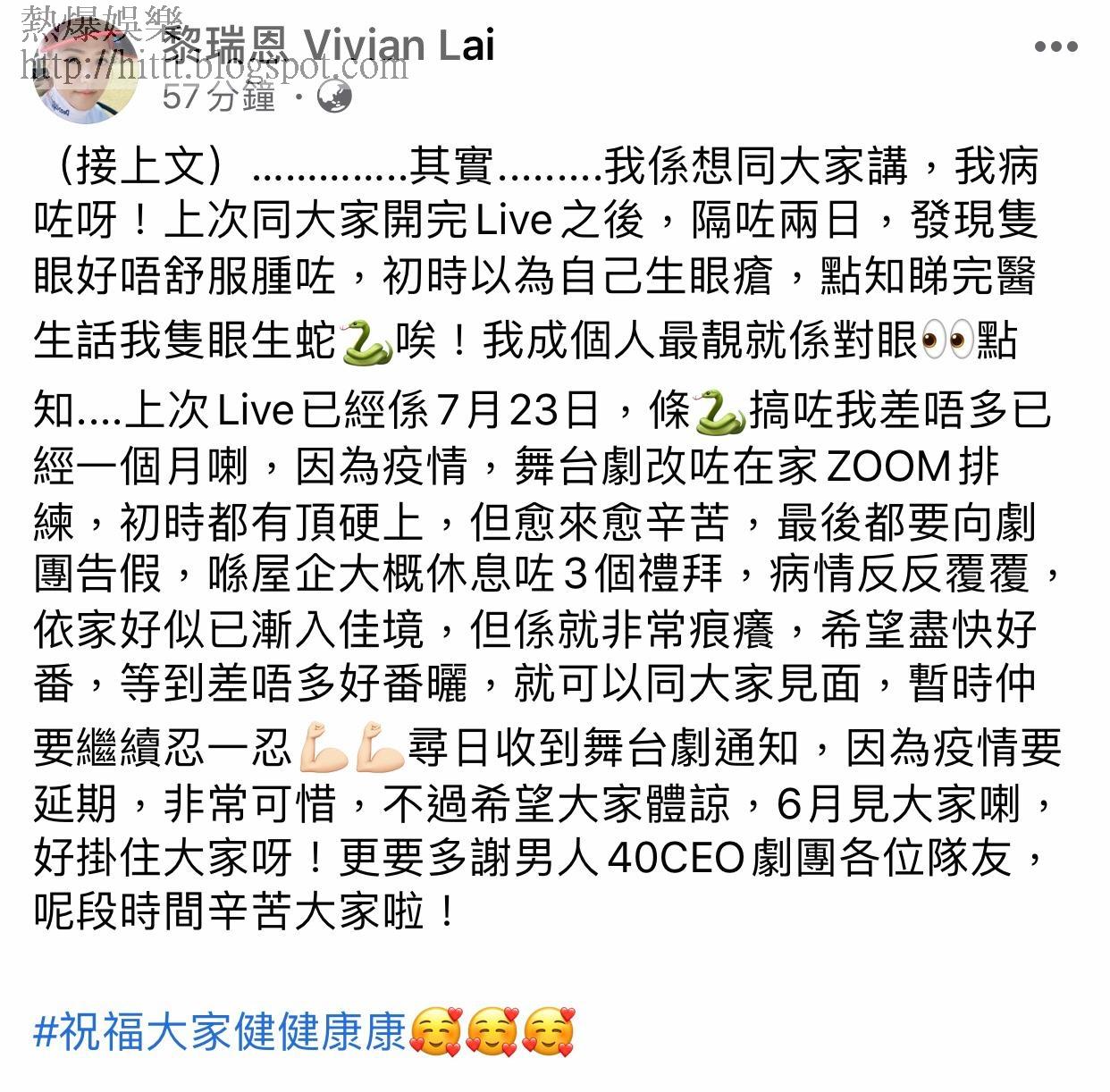 「其實.........我係想同大家講,我病咗呀!上次同大家開完Live之後,隔咗兩日,發現隻眼好唔舒服腫咗,初時以為自己生眼瘡,點知睇完醫生話我隻眼『生蛇』,唉!我成個人最靚就係對眼,點知....上次Live已經係7月23日,條蛇搞咗我差唔多已經一個月喇,因為疫情,舞台劇改咗在家ZOOM排練,初時都有頂硬上,但愈來愈辛苦,最後都要向劇團告假,喺屋企大概休息咗3個禮拜,病情反反覆覆,依家好似已漸入佳境,但係就非常痕癢,希望盡快好番,等到差唔多好番晒,就可以同大家見面,暫時仲要繼續忍一忍。噚日收到舞台劇通知,因為疫情要延期,非常可惜,不過希望大家體諒,6月(明年)見大家喇,好掛住大家呀!更要多謝男人40CEO劇團各位隊友,呢段時間辛苦大家」