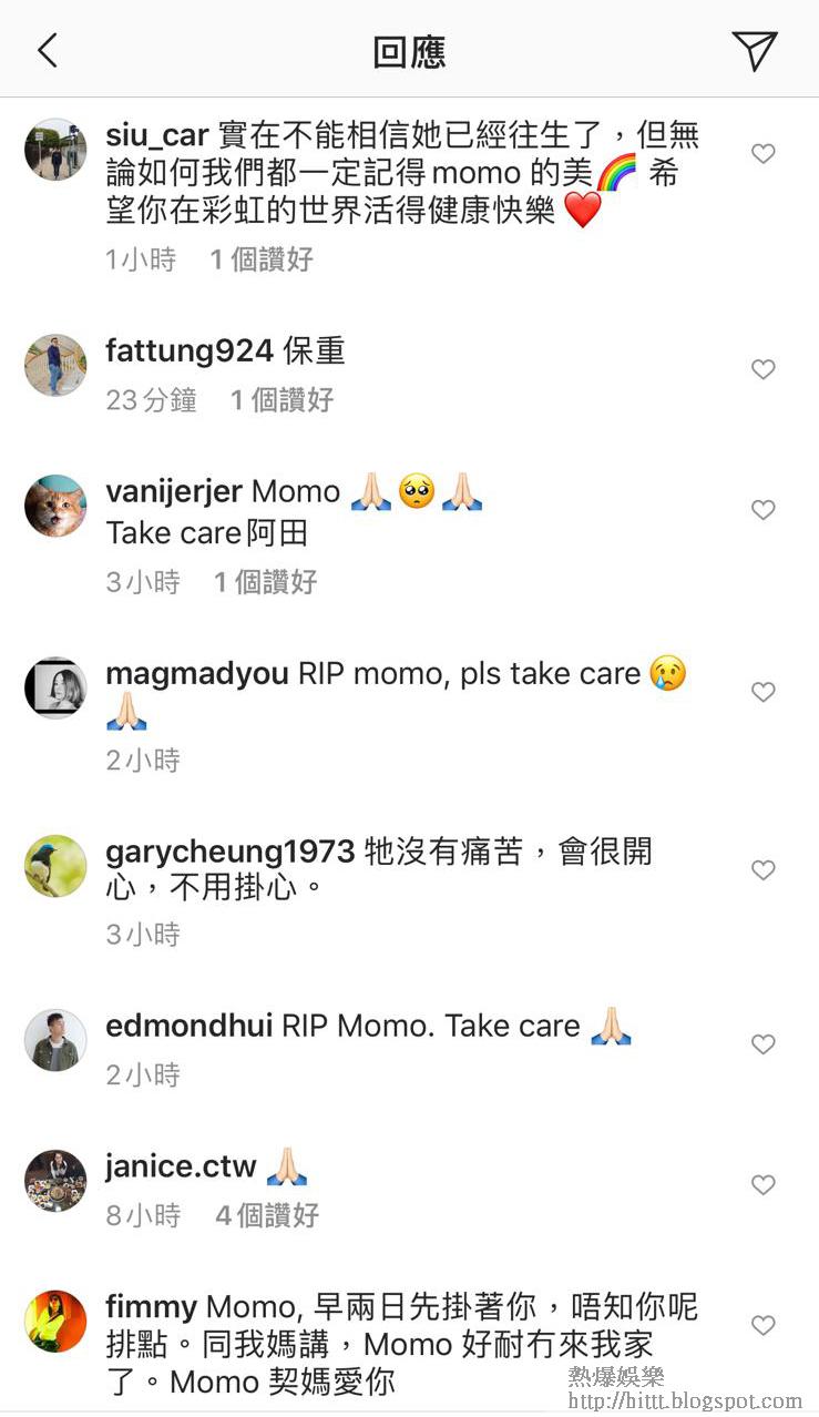 而十分疼愛Momo的阿澤,亦在差不多時間貼文,並貼了一張拍攝家中樓梯的相片,然後說:「要慢慢習慣早起時沒有妳的日子,生命無常,至少我有好好珍惜過。人生就只是一個經歷,請大家保重,活在當下,過好每一刻!」不少網民都留言叫他保重,指Momo會在天上守護牠。