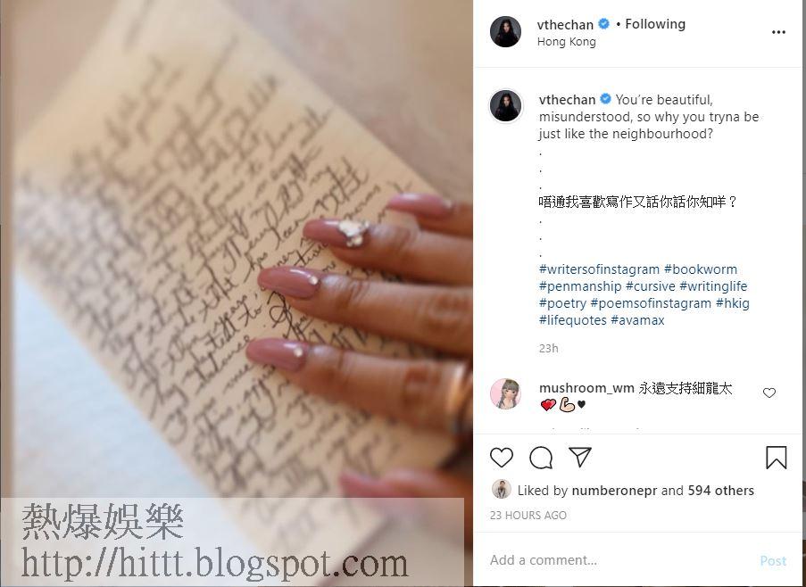 Vicky昨日亦有出post,言談間似乎覺得好多人不明白自己,貼了一張手寫的英文文章,留言:「There will be people who will never understand you. Your job isn’t to make them.(有人永遠不會了解你。你的工作不是要製造它們),唔通我喜歡寫作又話你知咩?」不少網民都留言叫她加油,表示永遠支持細龍太。