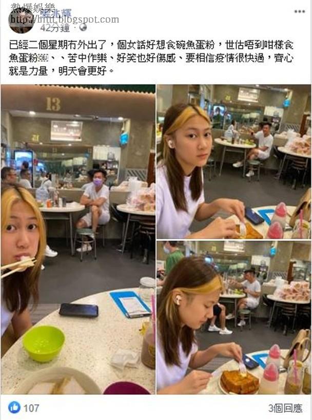 由於食肆規定每枱食客都唔可以坐多過二個人,所以張兆輝要同囡囡分枱坐,雖然係咁,但張兆輝一樣食得咁開心,他留言:「已經二個星期冇外出了,個女話好想食碗魚蛋粉,世(勢)估唔到咁樣食魚蛋粉 、苦中作樂、好笑也好傷感、要相信疫情很快過,齊心就是力量,明天會更好。」