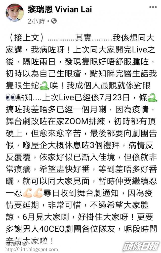 她發文說︰「我係想同大家講,我病咗呀!上次同大家開完Live之後,隔咗兩日,發現隻眼好唔舒服腫咗,初時以為自己生眼瘡,點知睇完醫生話我隻眼生蛇,唉!我成個人最靚就係對眼,點知...上次Live已經係7月23日,條蛇搞咗我差唔多已經一個月喇,因為疫情,舞台劇改咗在家ZOOM排練,初時都有頂硬上,但愈來愈辛苦,最後都要向劇團告假,喺屋企大概休息咗3個禮拜,病情反反覆覆,𠵱家好似已漸入佳境,但係就非常痕癢,希望盡快好番,等到差唔多好番(返)曬(晒),就可以同大家見面,暫時仲要繼續忍一忍。尋(噚)日收到舞台劇通知,因為疫情要延期,非常可惜,不過希望大家體諒,6月見大家喇,好掛住大家呀!更要多謝《男人40 CEO》劇團各位隊友,呢段時間辛苦大家」