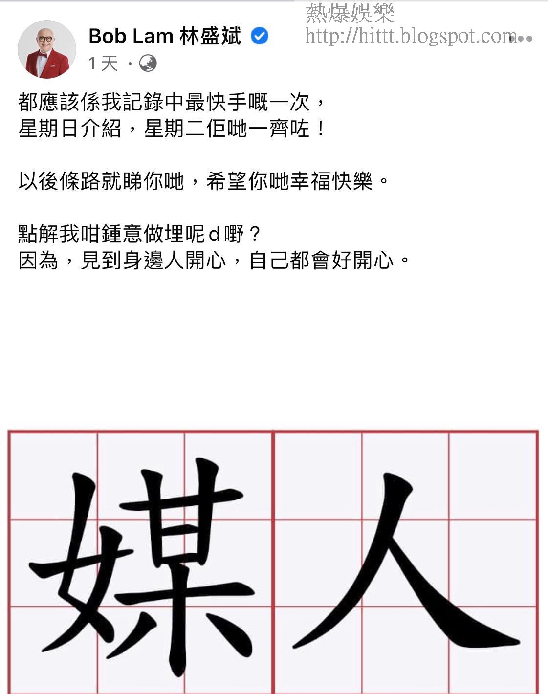 林盛斌(Bob)不時都在社交網上載他和太太Pearl,還有3女1子的一家六口幸福照,但原來多年來Bob和太太亦有化身當媒人,撮合身邊男女。昨日他在社交網貼上一張寫上「媒人」的圖片,並留言:「都應該係我記錄中最快手嘅一次,星期日介紹,星期二佢哋一齊咗!以後條路就睇你哋,希望你哋幸福快樂。點解我咁鍾意做埋呢d嘢? 因為,見到身邊人開心,自己都會好開心。」不過就沒有透露撮合成一雙一對的人是誰。