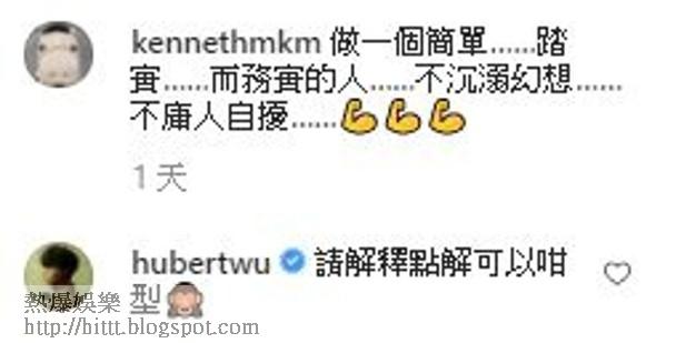 而佢都喺社交網上載咗新相,寫下:「做一個簡單……踏實……而務實的人……不沉溺幻想……不庸人自擾……💪💪💪」相中嘅佢坐喺梯級望住地下,若有所思咁!網民都讚佢「確係一個踏實嘅人」,更惹嚟圈中人忍唔住玩佢,胡鴻鈞留言:「請解釋點解可以咁型🙈」張達倫見佢望住地下,就笑問:「跌咗嘢落地下?」蕭正楠搭訕答:「倒瀉碗湯🤔」馬國明冇好氣咁回覆:「搵緊畀你哋賺咗嘅$$$……🙄🙄🙄」對話令人發笑!