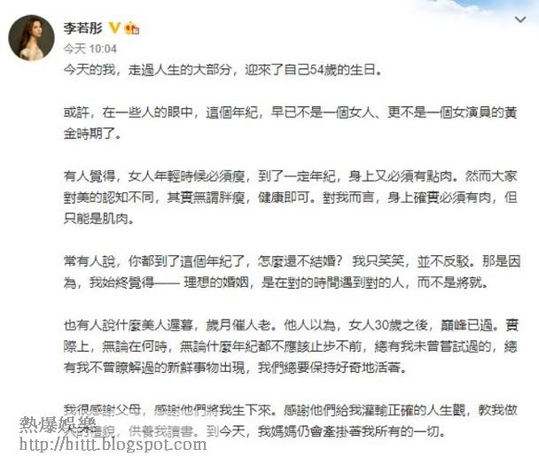 「最美小龍女」李若彤嘅真實年齡一直成謎,呢日佢趁住自己生日,罕有於社交網揭露原來踏入54歲,其實一直以嚟網上資料顯示佢係47歲,因為佢保養得宜,好多人都信佢47歲!佢感而發表示:「今天的我,走過人生的大部分,迎來了自己54歲的生日。或許,在一些人的眼中,這個年紀,早已不是一個女人、更不是一個女演員的黃金時期了。有人覺得,女人年輕時候必須瘦,到了一定年紀,身上又必須有點肉。然而大家對美的認知不同,其實無謂胖瘦,健康即可。對我而言,身上確實必須有肉,但只能是肌肉。」