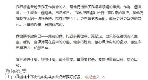 至於講到為何不結婚,佢就坦言:「我始終覺得,理想的婚姻,是在對的時間遇到對的人,而不是將就。」並指有人認為女人30歲後巔峰期已過,但佢就認為無論任何年紀,都應該不斷增值自己、努力進步。佢又答謝父母嘅教育,並感激曾給予佢工作機會的人,以及影迷一路以來嘅支持、厚待,並不忘勉勵自己:「我也要感謝自己。此刻的我,比從前更從容、更堅定。也只願在往後的人生裏,能夠一直保持現在從容的心態,健康的體魄。讓心保持向前的動力,讓生命更具活力。於願足矣。曾經遭遇甚麼,經歷甚麼,都不重要。最重要的是,要懂得重新出發,從心出發。人生從來不由他人定義,我們都要好好過。」