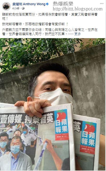 明哥今早亦貼了手執《蘋果》的相片,留言:「臨瞓前走咗落街買兩份,如果唔係我會瞓唔着,其實又點會瞓得着呢!我哋瞓唔着時,邪惡嘅政權都唔會有覺好瞓!外國勢力並不需要你去勾結;同理心與惻隱之心人皆有之,世界在看,世界會繼續與港人同行,我們並不孤單。買了兩份:一份撐蘋果;一份撐周庭及年輕的手足們。天佑好人。#他不過想要愛差點上斷頭台#撐蘋果日報」