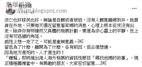 杜汶澤亦有在FB出帖文,未有提及羅冠聰名字,不過提及沒有人願意離鄉別井:「流亡也好移民也好,無論是自願或者被迫,沒有人願意離鄉別井。就算身在外地,只要每天還在留意着家鄉的消息,心理上根本從來沒有出走。除非你有明確而又具體的發展計劃,要是為求心靈上的平靜,世上沒有可逃避的角落。」他更揚言他的網台「喱騷」即將推出港人海外發展的資訊節目《尋找他媽的故事》,更hashtag了「#本節目不適合收成期人士觀看」。