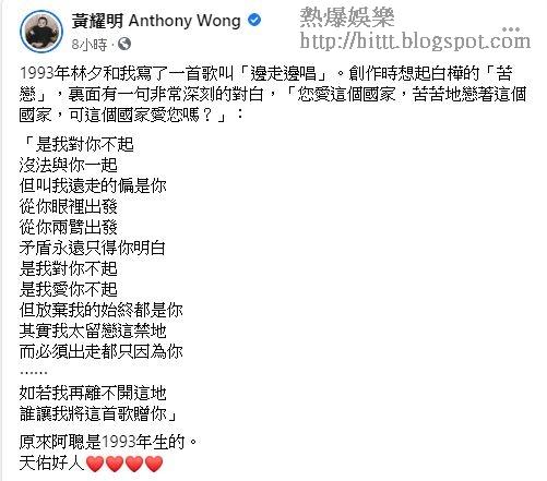 此外,黃耀明亦有在IG出帖文寫出林夕於1993年為他主唱的歌曲《邊走邊唱》歌詞,更提到當時林夕以大陸已故作家白樺的劇本《苦戀》為靈感,當中對白提到「你愛這個國家,苦苦地戀着這個國家,可這個國家愛你嗎?」,更提到羅冠聰是1993年出世,最後祝願羅冠聰:「天佑好人」。王宗堯就在FB出帖文,以英文留言:「Stay safe. You will always be on your minds!! Until then.」