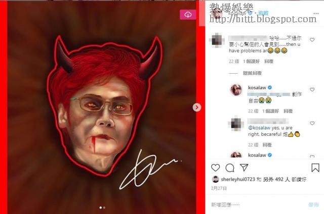其實羅詠怡今年2月時,曾經在IG中貼出自己的畫作,而其中一張,她表示在網上找了一位「阿婆」來畫,但這幅作品中的人物與林鄭有87%相似,最重要的是,她將這個「阿婆」畫成魔鬼,在她頭上加上兩隻角,眼睛變成黃色和紅色、嘴角滲血等,當時已有網民留言讚「Good Job」,亦有人提醒「小心高層照你肺」,不過她當時就以「創作自由」來回覆網民。
