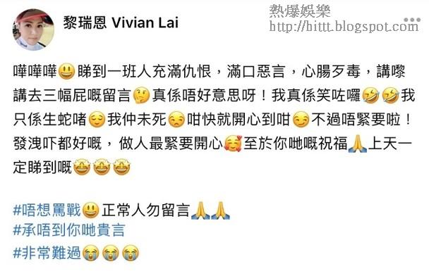 小恩子「生蛇」苦不堪言,前晚在社交平台上載爛面相,親自交代病情,卻因政見問題,被網民圍攻及詛咒,昨日她忍不住發文還擊:「嘩嘩嘩,睇到一班人充滿仇恨、滿口惡言、心腸歹毒、講嚟講去三幅被嘅留言,真係唔好意思呀!我真係笑咗囉!我只係生蛇啫,我仲未死,咁快就開心到咁?不過唔緊要發洩吓都好嘅,做人最緊要開心,至於你哋嘅祝福,上天一定睇到嘅。」獲不少粉絲留言力撐,但迅即再掀起另一場舌戰。